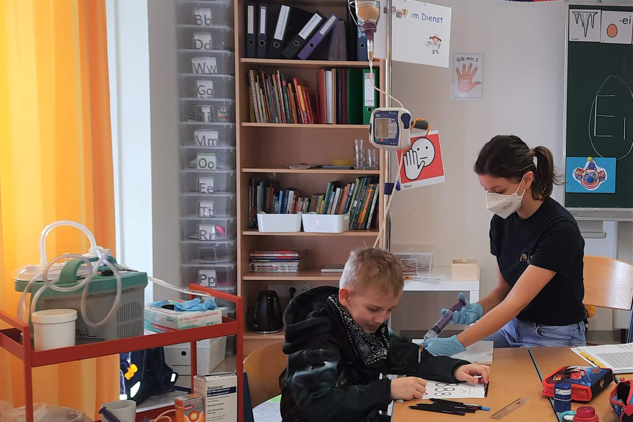 Mit Ernährungspumpe, Absauggerät und MOKI-Wien Pflegeperson – so kann Rudi* in die Schule.